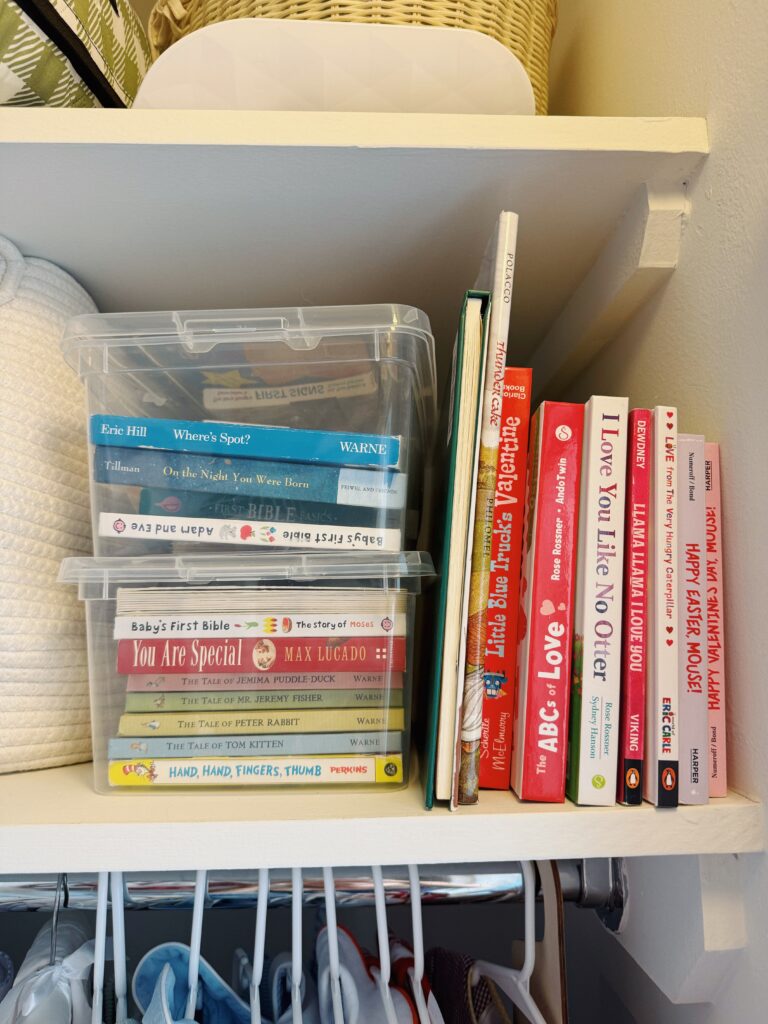 Can you believe this is a New York city closet? We really did luck out. Shep’s is bigger than mine! I try to do a toy rotation every day or two for him, so I’ve loved these small clear plastic bins for toys and books.
